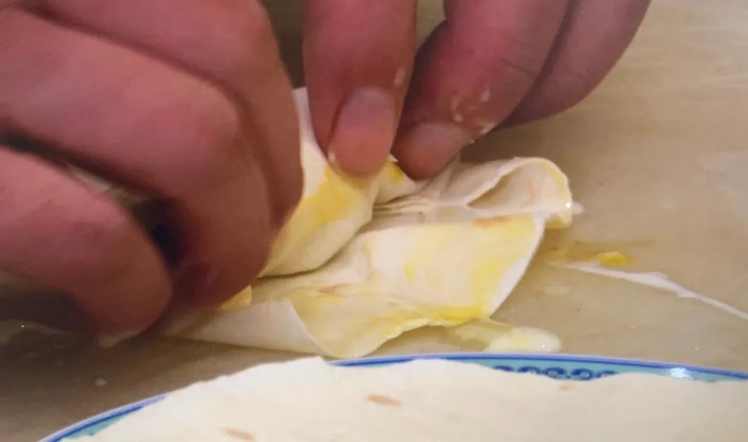 玉米粒略微加一点白糖略微提提味,拌匀之后再加一点糯米粉,芝士多放点,不然没有爆浆的感觉,打一个全蛋。拿一个小饼铺上,把刚刚已经拌好的玉米粒还有芝士都包裹进去,把它压紧压实,两边封一下口,加一点蛋液。