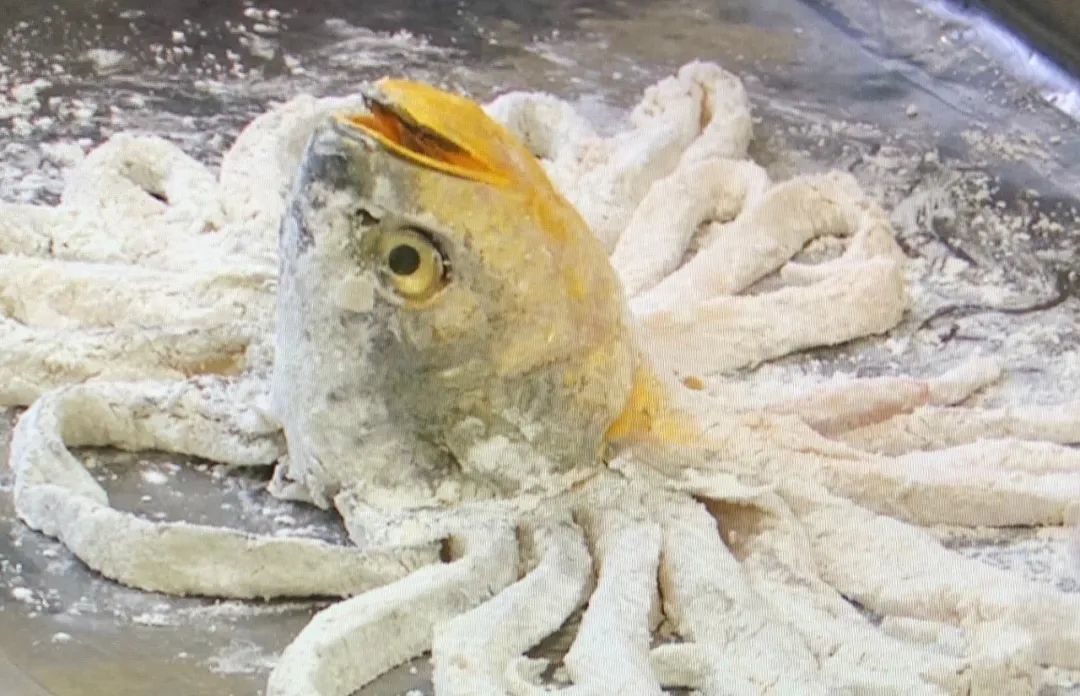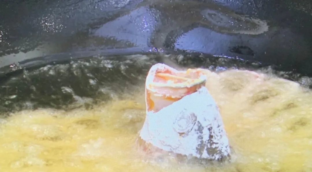 摆的时候鱼皮朝后面,鱼肉要朝前面,把摆好造型的鱼放到冰柜里面,冰冻四到五个小时,油烧到五六成热的时候炸一下,鱼炸到了火候之后会慢慢飘上来。