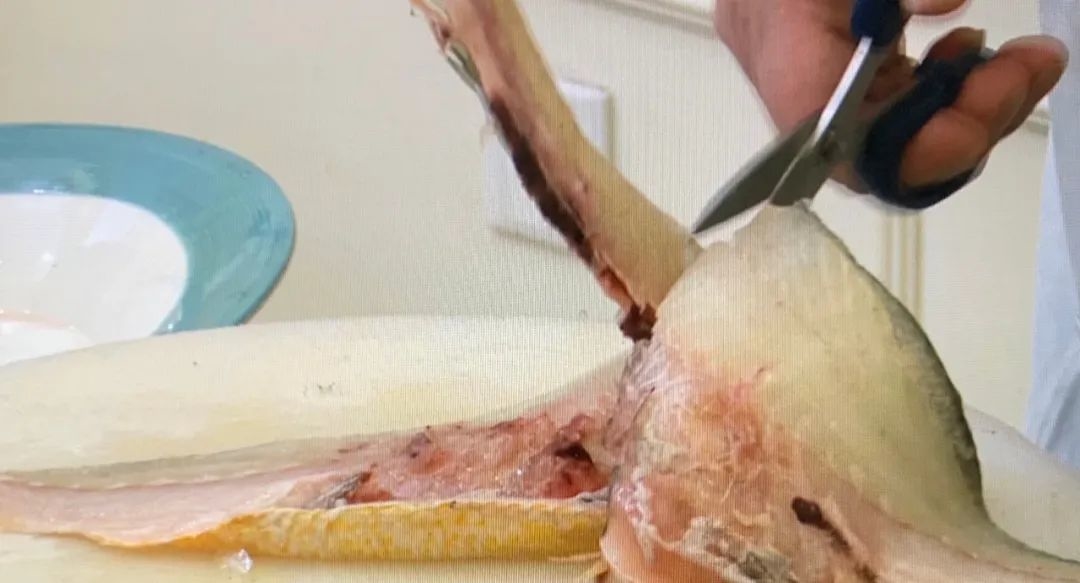 处理好的鱼从背部下刀到鱼尾部位,贴着这个中间的主骨,把鱼刺放开之后用剪刀把鱼刺去掉,把里面的内脏清理一下,鱼肉切成一条一条,处理好之后放在盆里,加点葱姜和料酒入一下底味,把玉米淀粉放到盆里,入好味的鱼裹上一层干淀粉放在一个托盘里。