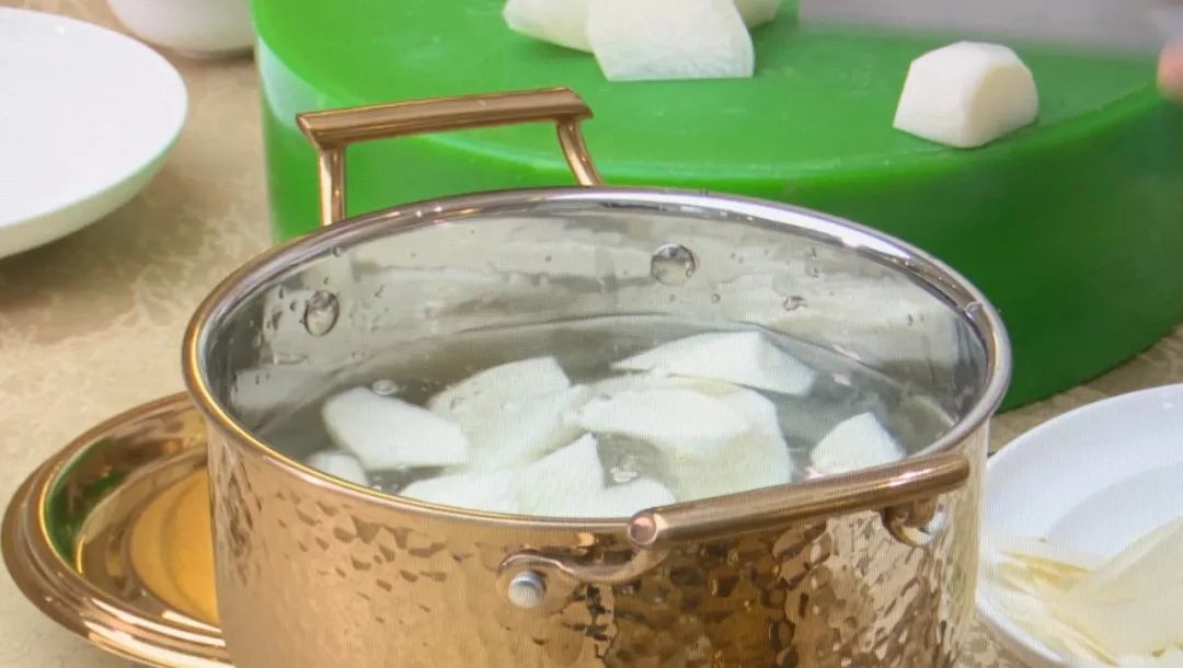 白玉萝卜食材普遍,生津止咳、健脾通气,还需要用到东北的长粒香米、青岛的瑶柱,调味品就是盐,萝卜去头去尾,皮给打掉,改成滚刀块,开火把萝卜放进去,开锅以后放入长粒香的香米,等水开了之后再来加米。