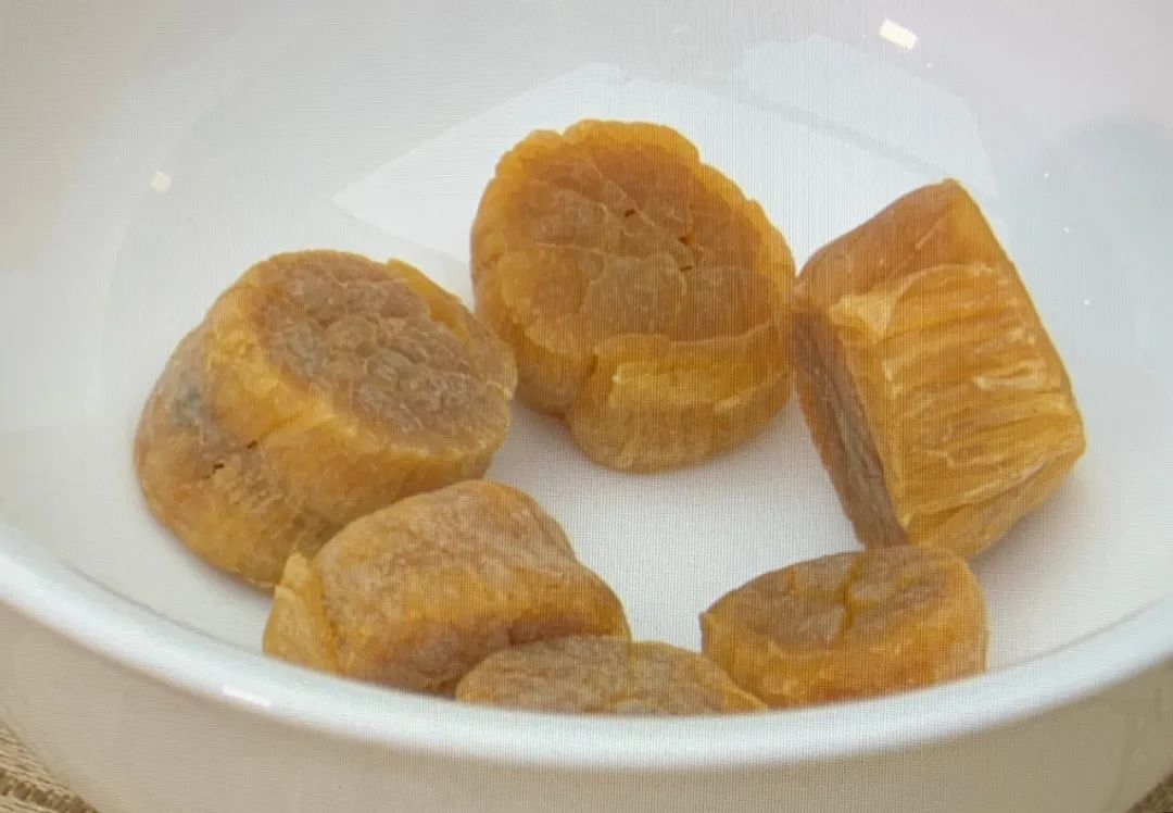 此时,重要的一步骤来了,为了保证菜品的口感,这道菜只需要米的香味但不需要米粒本身,所以将萝卜放入再次准备好的清水锅里,加入瑶柱继续煮至瑶柱变软。