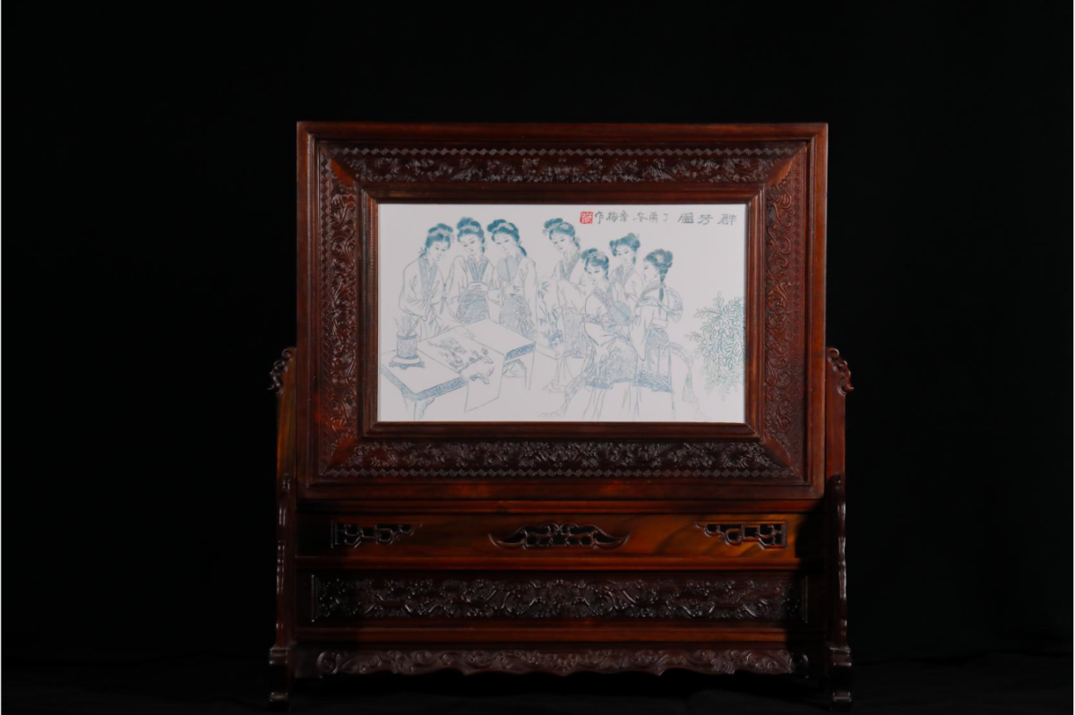 《群芳图》是在瓷板上进行雕刻,人物生动形象,展现出少女姣好的面容。现馆藏于山东省淄博市博山区陶瓷琉璃艺术大师蜡像馆。