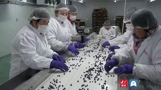 清洗鲜果、熬制成酱、冷却、包馅、杀菌、包装……兰香食品生产的蓝莓干等产品最大的特点就是无添加剂且不加一滴水。当一颗颗小浆果被做成蓝莓制品之后,营养被浓缩,同样的重量,营养密度却变得更高了,这让蓝莓深加工产品在市场上很受欢迎,通过美团、直播带货等线上销售,卖出了不少“爆款”。