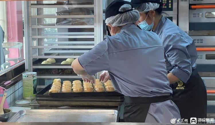 全透明厨房内,益康的员工检查新出炉的糕点