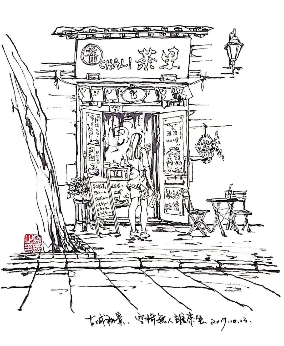 于街角、路口、石阶,铺纸、落笔