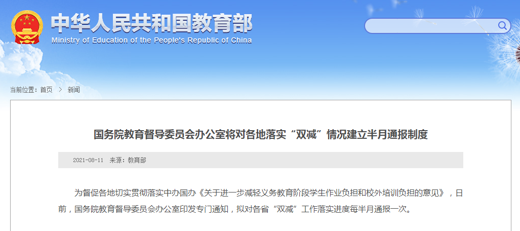 《通知》明确,各省自2021年8月30日起,每月15日和30日前,报送“双减”工作落实进度,国务院教育督导委员会办公室在汇总分析后形成专项督导半月通报。通报重点是各地作业时间达标学校情况、课后服务时间达标学校情况、学科类培训机构压减情况、违规培训广告查处情况和群众举报问题线索核查情况等。