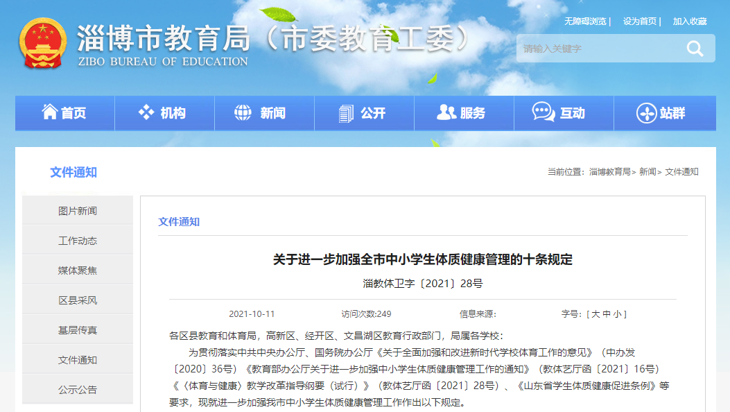 各区县教育和体育局,高新区、经开区、文昌湖区教育行政部门,局属各学校:为贯彻落实中共中央办公厅、国务院办公厅《关于全面加强和改进新时代学校体育工作的意见》(中办发〔2020〕36号)《教育部办公厅关于进一步加强中小学生体质健康管理工作的通知》(教体艺厅函〔2021〕16号)《〈体育与健康〉教学改革指导纲要(试行)》(教体艺厅函〔2021〕28号)《山东省学生体质健康促进条例》等要求,现就进一步加强淄博市中小学生体质健康管理工作作出以下规定。一、开齐开足上好体育课。各区县、学校要严格落实国家、山东省中小学课程方案要求,持续加强学校体育课程刚性管理,严格落实体育课程表网上公示、临时调课书面审批等制度,严禁出现削减、挤占甚至学期末提前停上体育课现象,保质保量上好体育课。深化体育教学改革,强化“教会、勤练、常赛”,构建科学、有效的体育与健康课程教学新模式,帮助学生掌握1至2项运动技能。推动小学、初中、高中体育课程一体化建设,在原有按“行政班级授课制”完成必修必学内容学习的基础上,小学高年级可增加学生的自主选择性,选择自己喜爱的运动项目进行学习,有条件的学校可采用“体育选项走班制”组织教学;初中丰富完善“体育选项走班制”的组织形式,提高学生的参与兴趣,加强必修选学内容的学习;高中以“体育选项走班制”为主,通过社团等组织形式,满足学生的运动兴趣和专项化发展需求。二、保障充足体育锻炼时间。进一步增加课外体育活动时间,确保中小学生每天在校内校外各参加1小时以上体育锻炼。深入实施阳光体育大课间专项提升行动,落实“中小学每天上午统一安排30分钟的大课间”规定。建立“学生课间走出教室适量活动和放松”的工作机制。规范引导体育社会组织、俱乐部进校园,进一步丰富学校体育社团活动。合理安排体育家庭作业,引导学校通过信息化手段指导、督促学生高质量完成作业。鼓励区县、学校设计家长、学生参与合作的体育家庭锻炼内容。三、面向人人开展体育竞赛。围绕“周周有活动、月月有比赛、人人都参与”的目标要求,整合赛事资源,经常性开展面向人人的体育竞赛,市级每三年举办一届学生运动会,每年举办高水平、专业化的体育竞赛活动,发挥示范引领作用。各区县要积极开展丰富多彩的青少年体育竞赛活动,每年举办学生运动会或体育节。中小学校要广泛开展班级、年级体育比赛,每年至少举办一次全员参与的体育活动和一届综合性运动会,运动项目设置突出集体性、趣味性和教育性,体现本校特色。四、发挥教科研引领作用。建立健全“行政+教研”一体推进学校体育工作管理机制,配强体育专职教研人员。加强教研平台建设,强化体育教研活动,推动体育教师教科研能力的全面提升,更好地推进新时代体育教学改革。完善体育课程和项目“超市”,满足学生多样化、个性化需求,探索构建学校体育校本课程体系。开展“零点体育课”改革试点,形成“一校一品”“一校多品”教学改革特色,提升课堂教学质量。加大对体育教师表彰力度,在教学成果奖等评选表彰中,保证体育教师占有一定比例。五、改善学校体育办学条件。各区县、学校要以抓好学生体质健康管理为契机,结合实际制定实施学校体育教师配备和场地器材建设三年行动计划,全面改善学校体育办学条件,配齐配强学校体育教师,建好满足体育教学和实践活动需求的场地设施、专用教室,配好体育教学所需器材设备,确保2022年全市中小学体育教师配备、运动场地设施器材建设达标。六、加强学生体质健康监测。全面学习贯彻落实《山东省学生体质健康促进条例》,依法推进学生体质健康促进工作。各区县教育行政部门要建立本区县学生体质健康促进中心,配齐配强学生体质健康专业队伍,完善常态化跨区域沟通交流机制,强化“行政、科研、教学、服务”一体化统筹作用,逐步形成各具特色、优势互补的体质健康提升新模式。加快推动体质健康测试自动化、信息化建设,实现学生体质健康大数据分析和精准指导。持之以恒地开展《国家学生体质健康标准》班班达标活动,认真落实面向全体学生的体质健康测试制度和抽查复核制度,准确建立学生体质健康档案,研判学生体质健康动态趋势,建立完善“监测—评估—反馈—干预—保障”闭环体系。七、完善体质健康评价考核机制。把体质健康管理工作纳入市对区县政府履行教育职责评价指标体系,对学生体质健康水平连续2年下降的区县,评价结果降低一个等级予以认定。将体质健康成效纳入学校、班主任、体育教师的评价体系,将评价导向从教师教了多少转向教会了多少,从完成课时数量转向教育教学质量。改革完善初中体育科目学业水平考试办法,建立“运动参与+体质健康测试+运动技能测试”的评价机制,探索将运动技能纳入过程性评价,提高体育中考分值占比。八、完善家校社联动发展机制。学校要健全家校沟通机制,通过家长会、家长信、家访等形式定期邀请专家开展线上、线下体质健康培训,及时将学生的体质健康测试结果和健康体检结果反馈家长。鼓励体育社会组织通过亲子活动、空中课堂等方式加强对中小学生体育锻炼的指导,逐步形成家庭、学校、社会联动,校内外覆盖的学生课外体育锻炼体系。协调好
