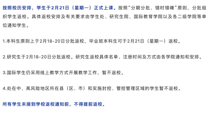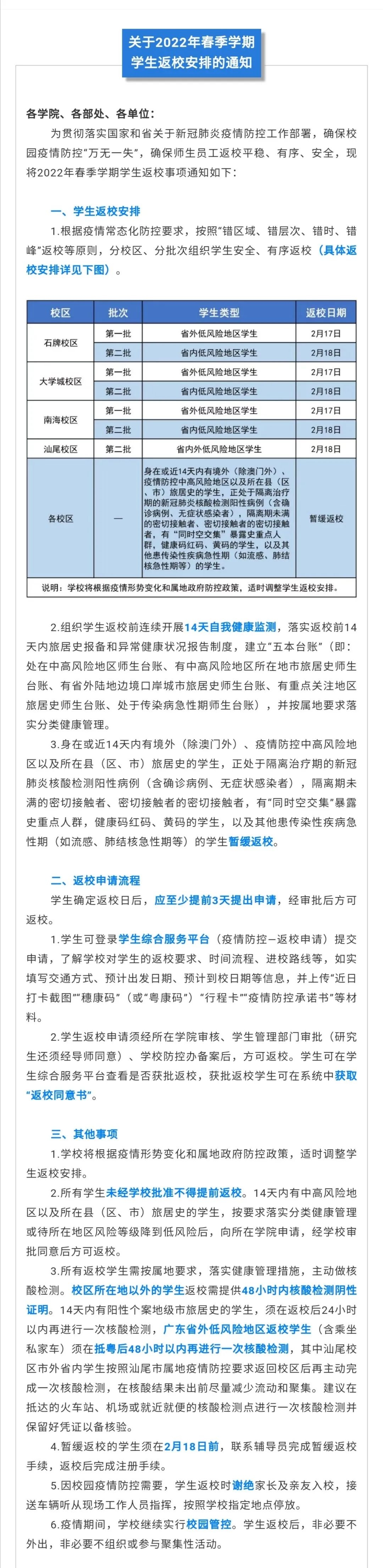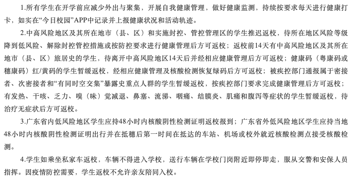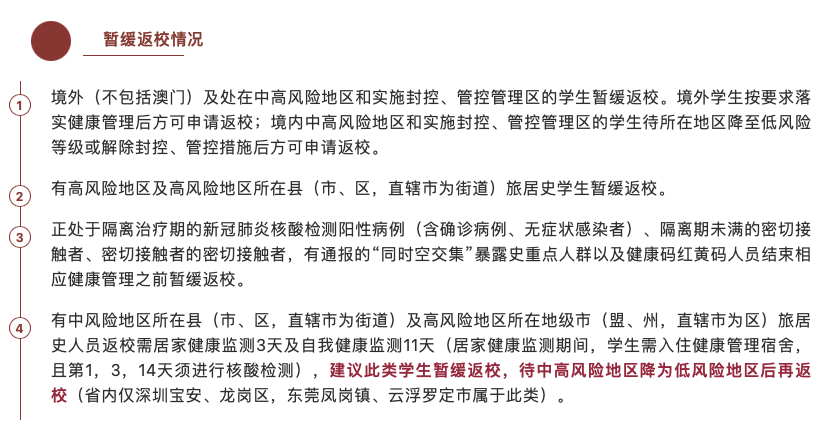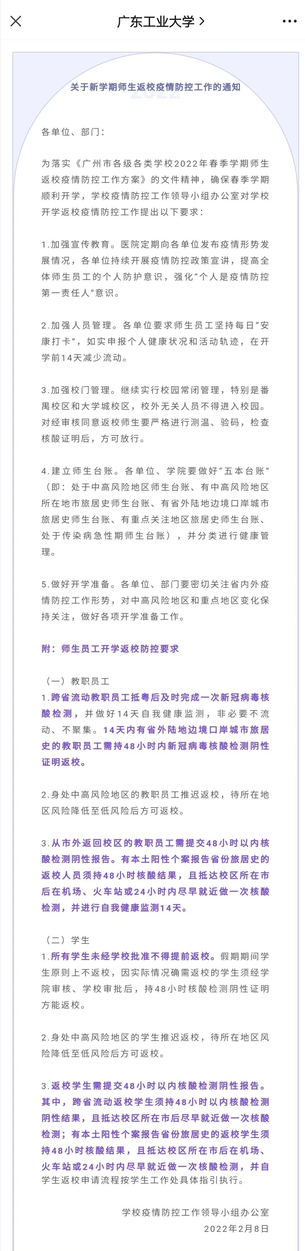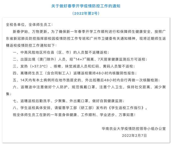 2月7日,中山大学发布返校指引。学校要求以下学生暂缓返校:身在或近14天内有境外(除澳门外)、疫情防控中高风险地区以及所在县(区、市)旅居史的学生,正处于隔离治疗期的新冠肺炎核酸检测阳性病例(含确诊病例、无症状感染者),隔离期未满的密切接触者、密切接触者的密切接触者,有“同时空交集”暴露史重点人群,健康码红码、黄码的学生,以及其他患传染性疾病急性期(如流感、肺结核急性期等)的学生暂缓返校;疫情期间,学校继续实行校园管控。学生返校后,非必要不外出,非必要不组织或参与聚集性活动。2月7日,华南农业大学发布疫情防控最新通知。通知提到:中高风险地区的同学暂缓返校,待所在地区风险降低至低风险后方可返校。假期期间确因实验急需提前返校的研究生,在符合返校条件的前提下,经导师同意,学院审批后可提前返校,集中在2022年2月12日通过西南门入校(具体安排另行通知)。其他同学积极关注学校春季学期返校安排,并严格按照返校安排按时返校,未经批准不得提前返校。学生从广州市外返校的,须持48小时核酸检测阴性证明,并在入校时主动出示健康码、行程码和核酸证明。加强校门管理。继续实行校园常闭管理,特别是番禺校区和大学城校区,校外无关人员不得进入校园;身处中高风险地区的学生推迟返校,待所在地区风险降低至低风险后方可返校;2月3日,广州大学发布返校指引通知。通知提到对以下学生暂缓返校:1. 在国内中高风险地区(实时更新)及其所在地市(县、区)的学生,或健康码(粤康码或穗康码)黄/红码的学生,或有病例接触史等尚在排查期的学生,或返校前14天有中高风险地区(实时更新)及其所在地市(县、区)旅居史的学生。2. 广东省、广州市防控指挥部确定为涉疫情重点关注地区(实时更新)的学生。3. 目前身处境外及入境后尚未完成有关入境人员防控管理要求集中隔离、居家隔离管理的学生。5. 有发热、干咳、乏力、嗅(味)觉减退、鼻塞、流涕、咽痛、结膜炎、肌痛和腹泻等症状的学生。2月7日,广东药科大学发布关于做好2022年春季学期学生返校工作的通知。通知提到:中高风险地区及其所在地市(县、区)和实施封控、管控管理区的学生推迟返校,待所在地区风险等级降到低风险、解除封控管控措施或按防控要求进行健康管理后方可返校;返校前14天有中高风险地区及其所在地市(县、区)旅居史的学生,待离开中高风险地区14天后并经相应健康管理后方可返校;健康码(粤康码或穗康码)红/黄码的学生暂缓返校,经相应健康管理及核酸检测恢复绿码后方可返校;被疾控部门通报属于密接者、次密接者和“有同时空交集”暴露史重点人群的学生暂缓返校,按疾控部门要求完成健康管理后方可返校;有发热、干咳、乏力、嗅(味)觉减退、鼻塞、流涕、咽痛、结膜炎、肌痛和腹泻等症状的学生暂缓返校,待治疗无症状后方可返校。2月7日,广东技术师范大学发布返校通知。通知提到:按照“分期分批、错时错峰”原则,分批组织学生返校;国际学生仍采用线上教学方式开展教学工作,暂不返校;处在中、高风险地区所在县(区、市)和实施封控、管控管理区域的学生暂不返校。记者了解到,广西大学原本计划从2月11日起全日制学生错峰分批返校注册、上课。2月9日,广西大学发出通知,因目前区内疫情形势,根据上级文件精神及学校实际情况,研究决定学生延期返校。学校教学工作按原计划进行,由线下教学改为线上教学。学生具体返校时间视实际情况另行通知,有中高风险地区旅居史的师生员工暂缓返校。此外,广西大学还将加强对留校学生、提前返校学生的管理,非必要不离校,确有必要离校的需严格履行审批手续。广西医科大学近日召开寒假与春节期间疫情防控工作紧急会议,针对目前国内、区内疫情防控形势和学校实际做了部署。记者从该校获悉,目前学校指挥部教学保障组正牵头制定春季开学、春季授课计划方案和预案(线上+线下),2022年春季开学返校时间以学校近期新的通知为准。学校已启动校园出入管理应急预案,加强校门管控;全面进行校内人员有无风险地区旅居史排查;明确近期从百色市等风险地区返校学生隔离观察场所,按照上级部门相关文件要求做好隔离观察等。2月9日,南宁师范大学也发出了关于师生员工返邕(校)和疫情防控的通知。通知指出,学生原则上按原定的开学时间返校,未经批准,不得提前返校。目前仍在百色市右江区、田阳区、德保县、隆林各族自治县、靖西市的教职员工,非必要暂不返邕(校)。记者注意到,按原计划,3月6日为该校学生返校报到注册、领取教材时间。通知明确,学校将根据疫情防控最新形势和上级统一部署进行动态调整。如有变化,学校将另行通知。除了返校方案有调整外,还有高校发出考试提醒。广西艺术学院2022年艺术类本科专业招生考试南宁考点现场校考将于2022年2月20日举行。2月8日,该校招生办公室发出通知,鉴于目前疫情形势对南宁考点校考工作带来的影响,明确已在集中隔离点的考生、被要求居家隔离(监测)或安排在临时住宿酒店的考生,持红、黄码的考生或在考前14天内出现疑似新冠肺炎症状、有非低风险地区活动轨迹、与疑似病例和确诊病例有接触史或行程活动轨迹重合的考生,可申请延期考试。经审核符合延期考试的考生,学校将择期安排考试。详情可登录该校