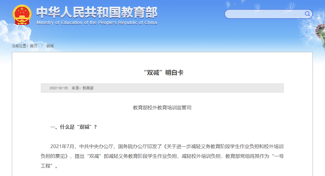 2021年7月,中共中央办公厅、国务院办公厅印发了《关于进一步减轻义务教育阶段学生作业负担和校外培训负担的意见》,提出“双减”即减轻义务教育阶段学生作业负担、减轻校外培训负担,教育部党组将其作为“一号工程”。