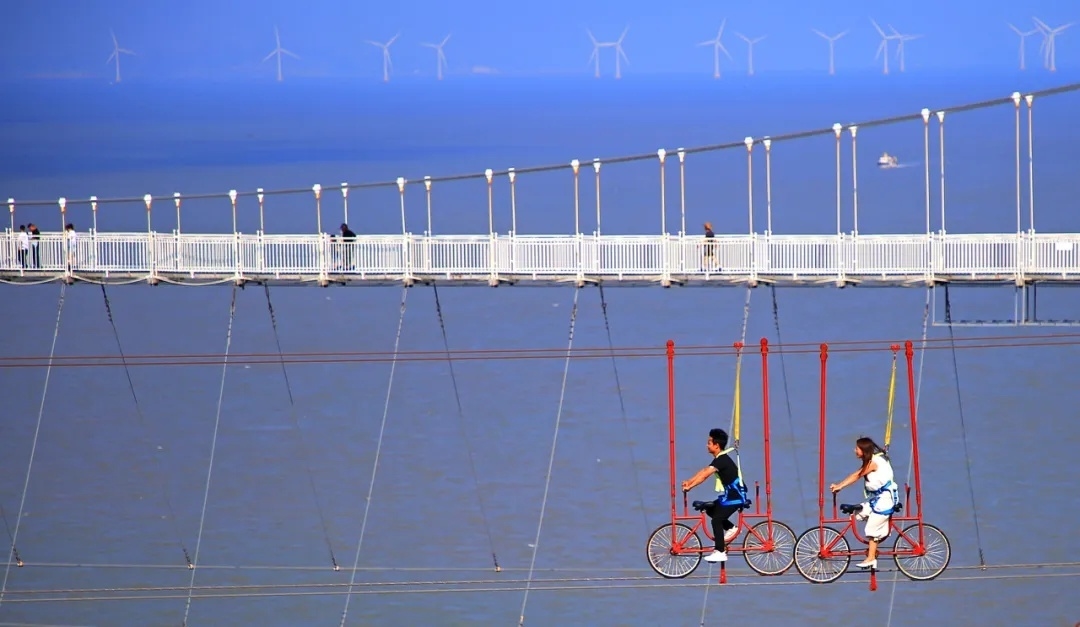10月1日,玉环市干江镇上栈头景区,游客在体验高空骑车等项目 图源:潮新闻客户端
