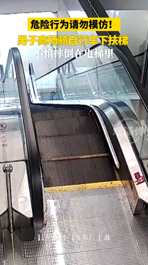 危险行为请勿模仿!男子商场骑自行车下扶梯,不慎摔倒在电梯里