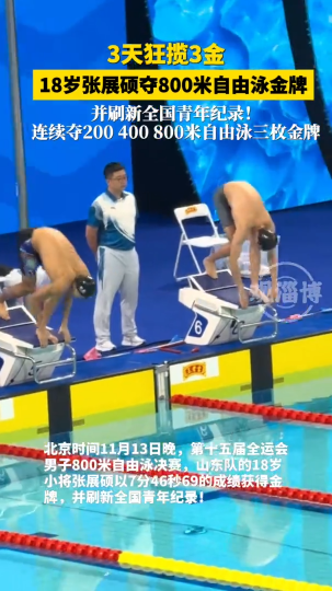 3天狂揽3金,18岁张展硕夺800米自由泳金牌并刷新全国青年纪录