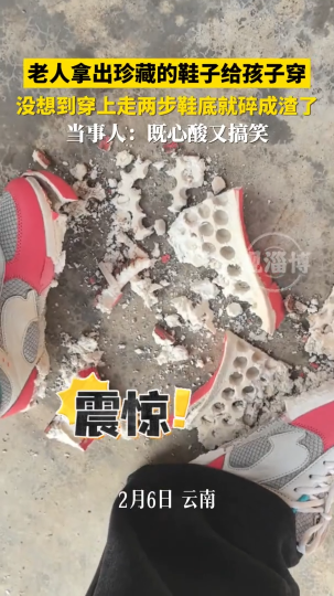 老人拿出珍藏的鞋子给孩子穿,没想到穿上走两步鞋底就碎成渣了