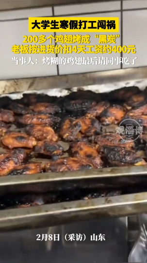 大学生寒假打工闯祸,200多个鸡翅烤成"黑炭”,老板按进货价扣4天工资约400元