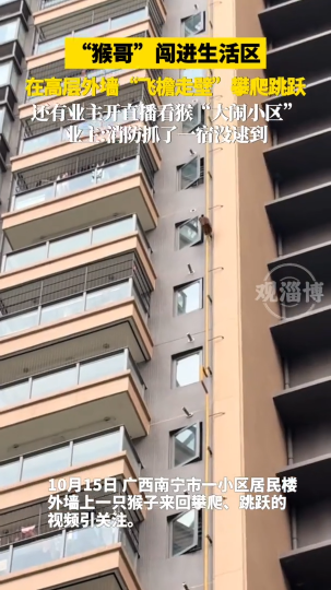 “猴哥”闯进生活区,在高层外墙“飞檐走壁”攀爬跳跃