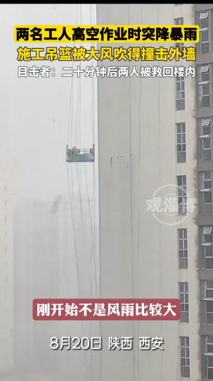 两名工人高空作业时突降暴雨,施工吊篮被大风吹得撞击外墙