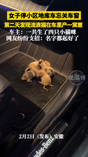女子停小区地库车忘关车窗,第二天发现流浪猫在车里产一窝崽