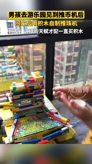 男孩去游乐园见到推币机后,回家用积木自制推珠机