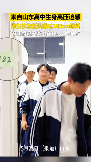 来自山东高中生身高压迫感,男生依次低头通过182cm标线