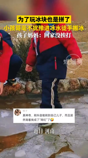 为了玩冰块也是拼了,小孩哥毫不犹豫进冰水徒手搬冰