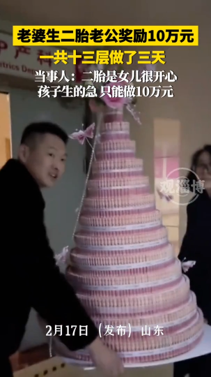 妻子生二胎,老公送上“钱塔”,共计10万元,寓意“有钱花”