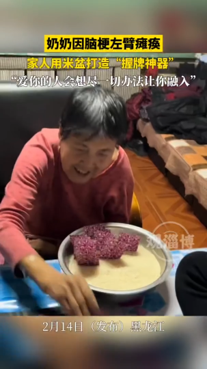 奶奶因脑梗左臂瘫痪,家人拿来米盆方便奶奶理牌,“爱你的人想尽办法让你融入”
