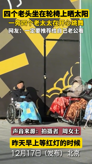 四个老头坐在轮椅上晒太阳,旁边四个老太太在跳舞