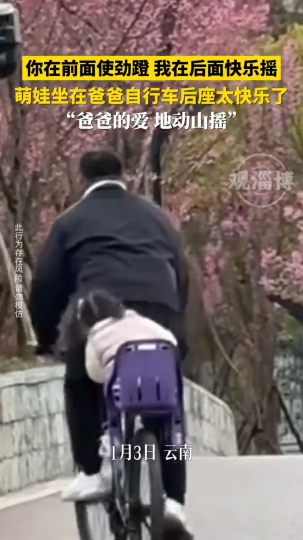 你在前面使劲蹬,我在后面快乐摇,萌娃坐在爸爸自行车后座太快乐了