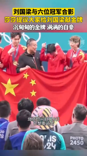 刘国梁与六位冠军合影,莎莎提议大家给刘国梁献金牌