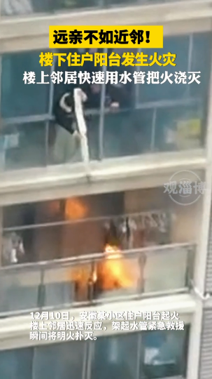楼下住户阳台发生火灾,楼上邻居快速用水管把火浇灭