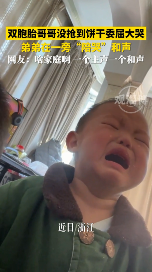 双胞胎哥哥没抢到饼干委屈大哭,弟弟在一旁“陪哭”和声