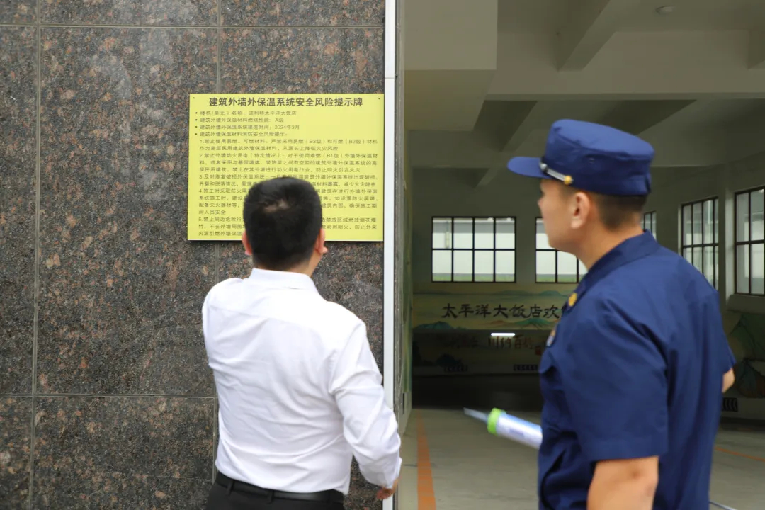 一、统计信息。全面梳理辖区内高层民用建筑基本情况,一方面,详细采集建筑外墙外保温系统的建造信息,包括保温系统建造时间、建造形式、材料性能、系统完整性等基础信息;另一方面,深入排查系统存在的安全风险,如材料存在的防护层破损、开裂、脱落,保温材料燃烧性能衰减等问题,建立健全外墙保温材料信息台账,明确整治范围和对象。二、核对资料。对照建筑审批档案、验收报告等,核实建筑保温材料的防火等级、生产厂家等关键信息,确保数据准确。三、现场抽检。组织专业人员对建筑外墙保温材料进行实地取样检测,严查不合格材料使用情况。四、安全警示。对检查中发现的隐患问题,现场向产权单位、管理方进行约谈警示。五、统一制作。按照规范标准设计标识样式,统一制作两类标识牌:建造信息公告牌集中展示建筑外墙外保温系统的建造信息,让居民和管理方清晰了解建筑保温系统的“前世今生”。安全风险提示牌则是精准标注排查出的安全风险点及相应防范措施,对存在较高风险的建筑进行重点提醒。六、一楼一牌。逐栋建筑张贴在建筑主要出入口显眼处或楼栋外立面易读位置,既美观又清晰可辨,实现“一楼一牌、信息公开、风险可视”,便于监督管理。七、全面覆盖。目前辖区高层公共建筑“一楼一牌”已张贴完毕。