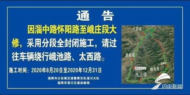 因位于淄川区太河镇境内的淄中路怀阳路至峨庄段大修,采用分段全封闭施工,请过往车辆绕行峨池路、太西路。施工时间为2020年8月20日至2020年12月31日。