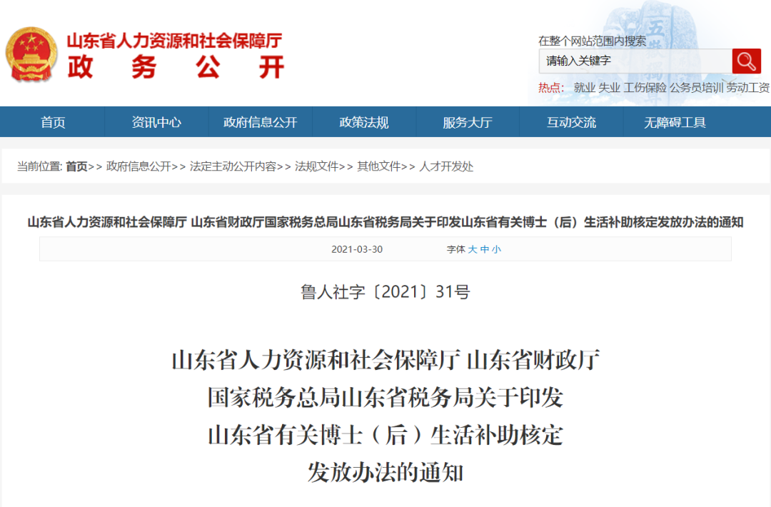 自2020年2月24日起,对到我省博士后科研工作站开展研究的博士后研究人员,符合条件的在站期间可享受每人每年5万元生活补助,在站时间每满1年发放1次,最长补助3年,总额不超过15万元。出站后留(来)鲁工作并签订3年及以上期限劳动(聘用)合同的博士后研究人员,可享受每人15万元一次性生活补助(视同省政府奖励)。