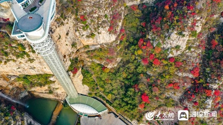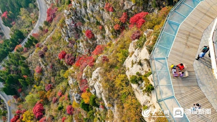 10月22日,在淄博潭溪山,漫山的树叶已逐渐由绿转红,航拍视角看去,玻璃栈道与满山秋色搭配在一起,大地如同一个巨大的调色盘一般壮观、美丽。