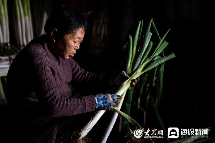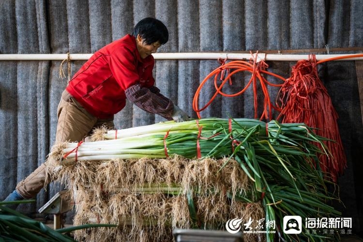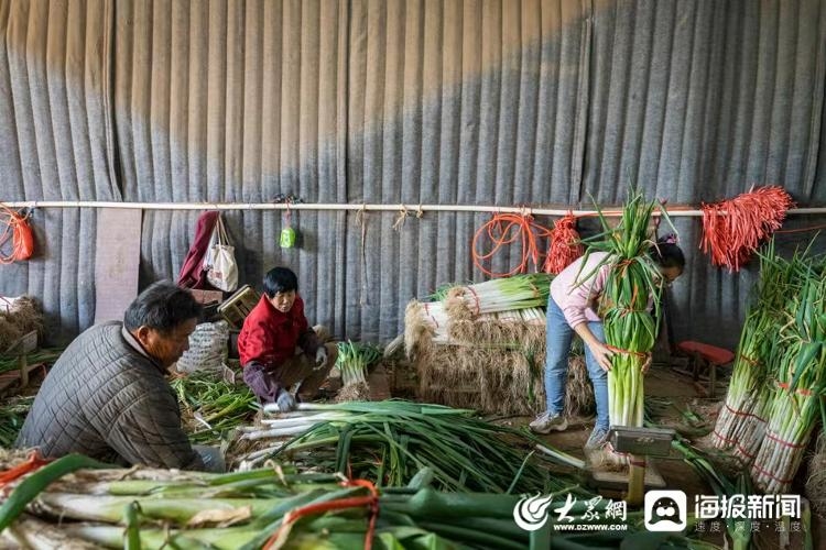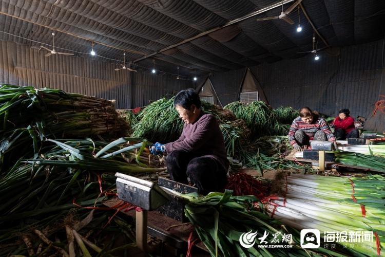 图:在大葱加工棚里,附近的村民正在帮唐文娜择葱、称葱、捆葱。(大众网·海报新闻记者 毕胜 摄)