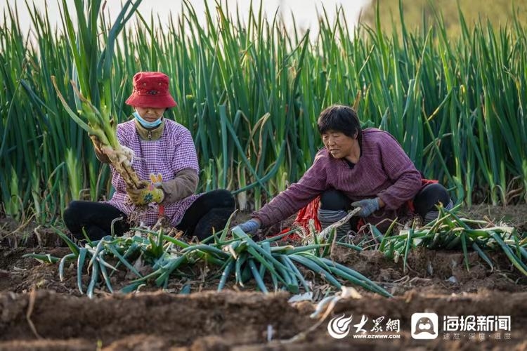 图:农户将刨出的大葱捆绑后装车。(大众网·海报新闻记者 毕胜 摄)