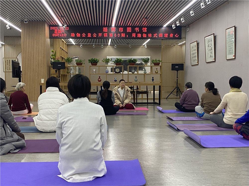 有人喜欢安静,有人喜欢运动,有人喜欢传统,也有人喜欢时尚。与曹玉霞安静剪纸的“幸福”不同,2023年12月23日上午,家住张店区中房翡翠郡的市民周华则穿着一身灰色的瑜伽服来到淄博市图书馆,体验正在这里进行的瑜伽公益课。课堂上,她与十几位市民一起,在舒缓空灵的音乐声中跟着老师一起学习瑜伽体式,身上已经微微出汗。