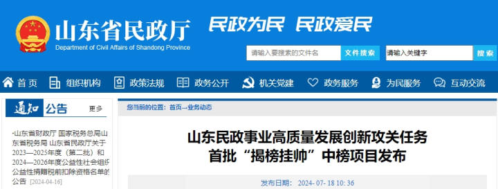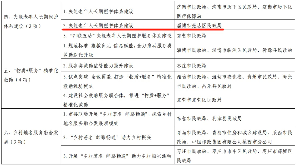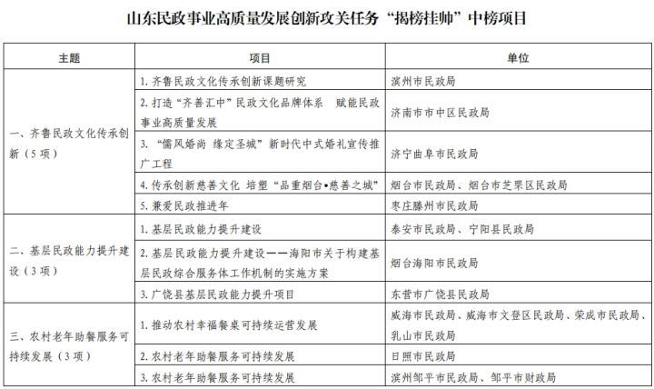 为深入实施山东民政事业高质量发展“1261”行动计划,创新推动民政事业高质量发展,鼓励全省各级民政部门改革创新、比学赶超,省民政厅组织开展了首批创新攻关任务“揭榜挂帅”评选,经自主申报、综合评审等程序,发布了山东民政事业高质量发展创新攻关任务“揭榜挂帅”中榜项目。项目涵盖齐鲁民政文化传承创新、基层民政能力提升建设、农村老年助餐服务可持续发展、失能老年人长期照护体系建设和“物质+服务”精准化救助5大主题,共计21个项目。
