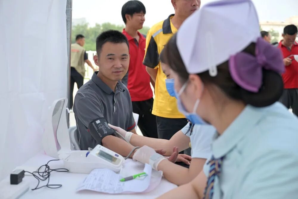 在北京工人体育场举办的新就业形态劳动者移动体检活动上,快递小哥在测血压。新华社记者 才扬 摄