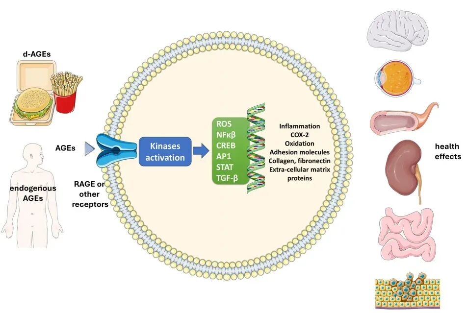 另一方面是外源性AGEs的风险。糖化反应的风险不仅取决于摄入还原糖的数量,还取决于食物中的糖分是否已经被预先加工成了AGEs(即膳食AGEs)。食物在高温、干热的烹饪方式下(如烘烤、煎炸)会发生美拉德反应,产生大量的膳食AGEs。研究显示,这些膳食AGEs是人体AGEs库的主要贡献者。这些外源性AGEs被吸收后进入体循环,加剧全身AGEs负担,并诱导炎症和氧化应激。