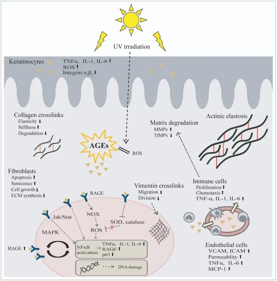 图 2. AGEs 对皮肤的影响:通过改变真皮蛋白的理化特性、降低细胞增殖能力、增加细胞凋亡和衰老、诱导氧化应激及促炎介质等多种途径,共同导致皮肤老化的外在表现(来自参考资料)。图源:科学辟谣