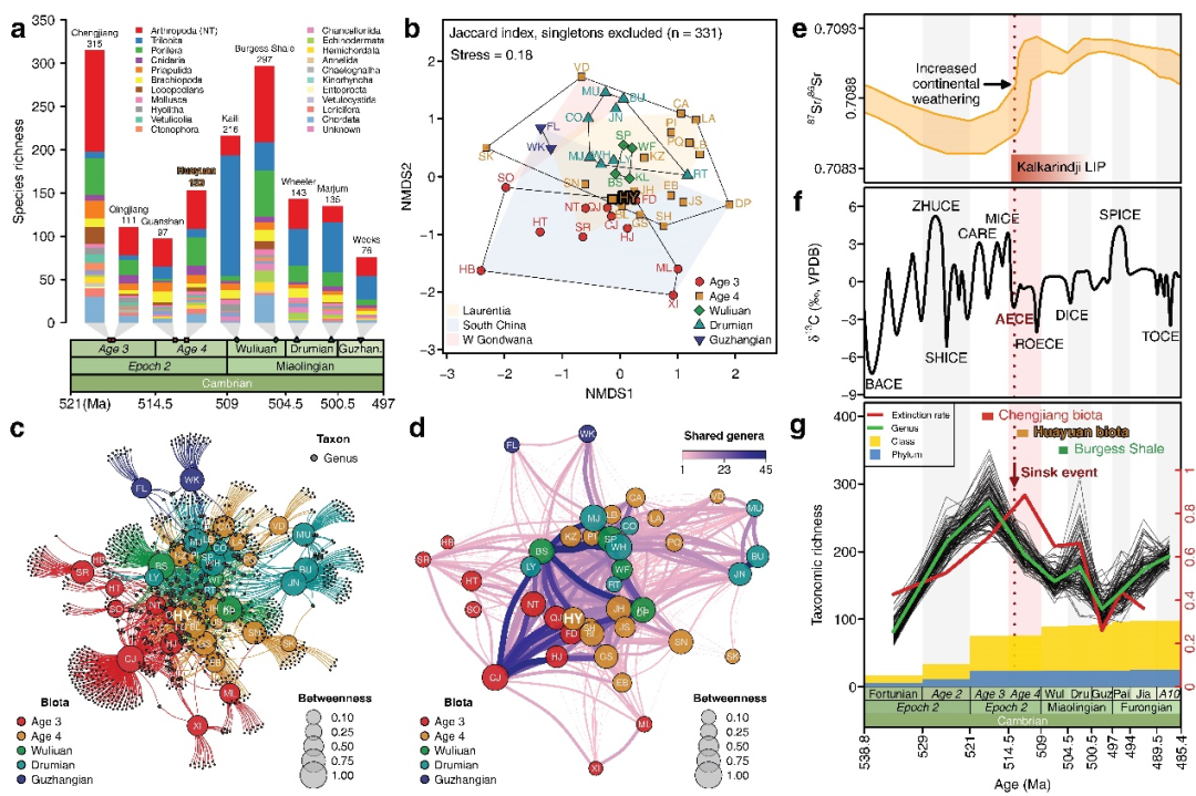 ▲语言花垣生物群与其他寒武纪特异埋藏化石群的对比分析,及其在寒武纪生物多样性演化和环境演变中的位置。