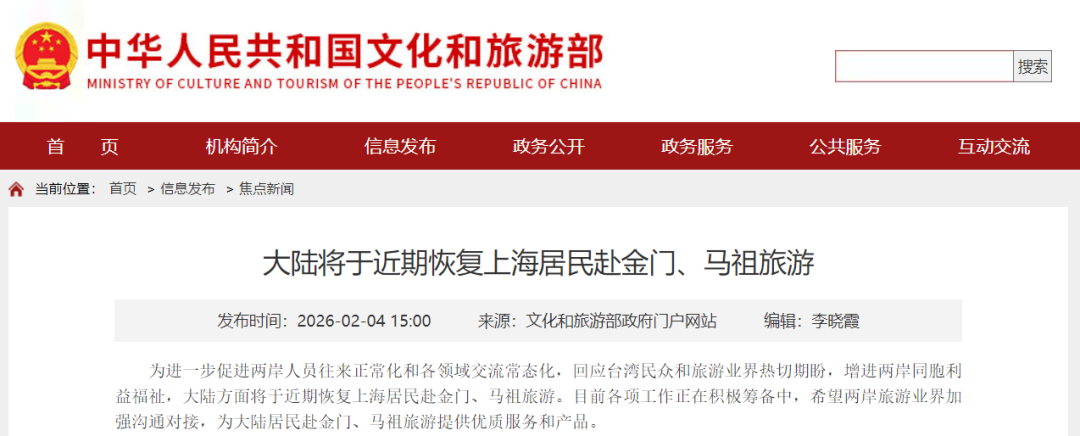 据文化和旅游部网站消息,为进一步促进两岸人员往来正常化和各领域交流常态化,回应台湾民众和旅游业界热切期盼,增进两岸同胞利益福祉,大陆方面将于近期恢复上海居民赴金门、马祖旅游。目前各项工作正在积极筹备中,希望两岸旅游业界加强沟通对接,为大陆居民赴金门、马祖旅游提供优质服务和产品。