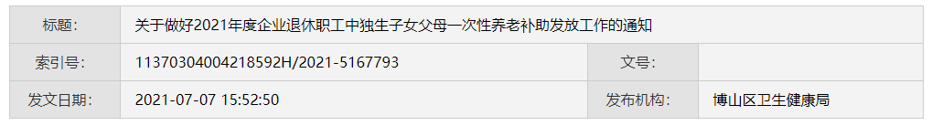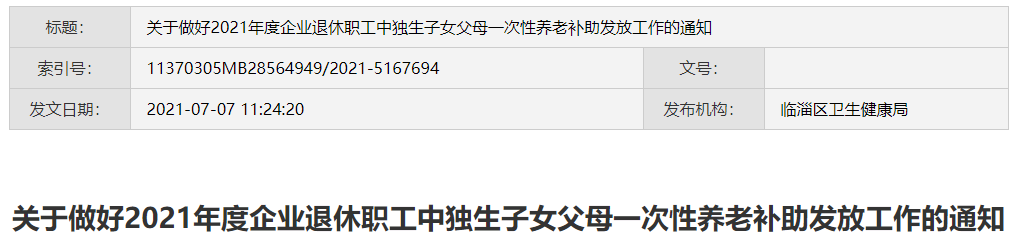 根据《山东省人口与计划生育条例》和《淄博市人民政府 关于认真落实企业退休职工中独生子女父母养老补助有关规定的通知》(淄政字〔2020〕102号)等有关精神,为落实好2021年度企业退休职工中独生子女父母一次性养老补助发放工作。现将有关事宜通知如下: