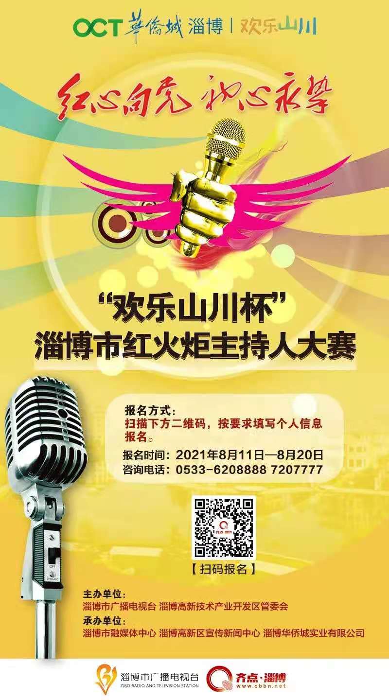 由淄博市广播电视台和淄博高新技术产业开发区管委会共同主办,淄博市融媒体中心、高新区宣传新闻中心、淄博华侨城实业有限公司联合承办的“红心向党 初心永挚”——“欢乐山川杯”淄博市红火炬主持人大赛开始报名,报名时间截止到2021年8月20日。有一定播音主持基础,有志于播音主持事业且年龄在24-35周岁之间均可报名参赛。大赛最终评选出一二三等奖并为获奖选手颁发荣誉证书和奖品,比赛成绩优异的选手将有机会成为淄博高新区融媒体中心签约主持人。