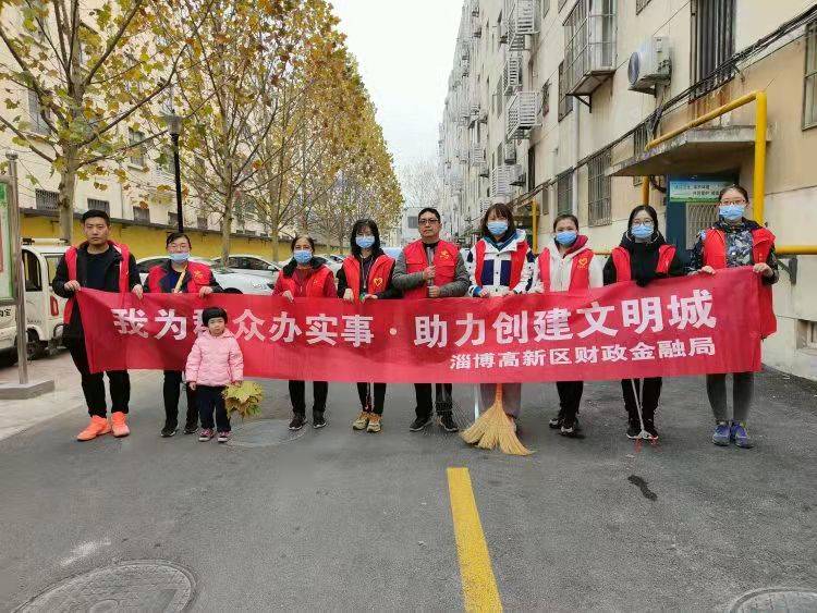 昨天,淄博高新区财金局组织党员干部到四宝山街道万杰路社区开展新时代文明实践“红火炬”志愿服务活动。通过清扫落叶、楼道保洁,清理小广告等美化社区环境。未来,该局将坚持每周六派出志愿者为“双报到”社区义务大扫除,持续助力文明城市创建。