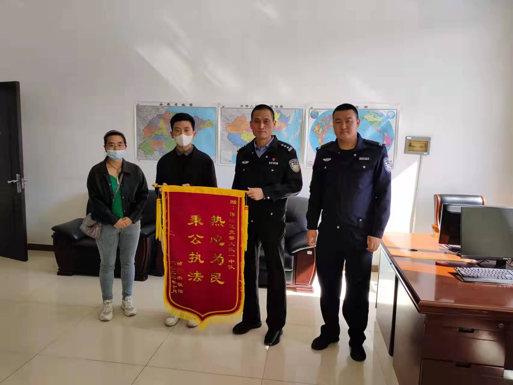 10月10日,后车驾驶员再次来到中队,表示因办案民警认真负责的态度,还己清白并让其免于经济损失,特地送来锦旗致谢。一次次秉公执法,不仅拉近了警民之间的和谐关系,更充分体现了博山交警以人为本的服务宗旨和对人民高度负责的态度,得到当事人的高度赞扬。