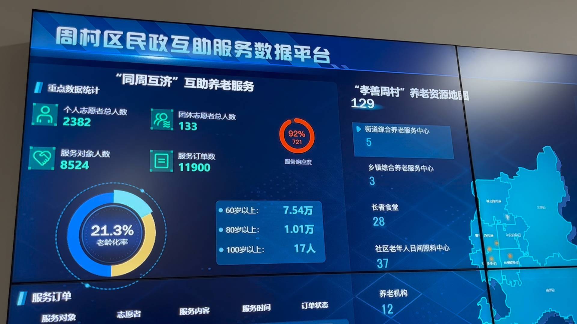 在周村区民政互助服务数据平台调度中心,大屏正在滚动,市民于加茂的家务料理服务,在志愿者的帮助下刚刚完成订单,刘秀云老人的上门送餐服务,高纪英老人的智能设备辅导培训服务正在等待志愿者接单。在中心的数据平台上可以清晰的看到,全区老人的数量、志愿者人数,以及志愿服务情况。