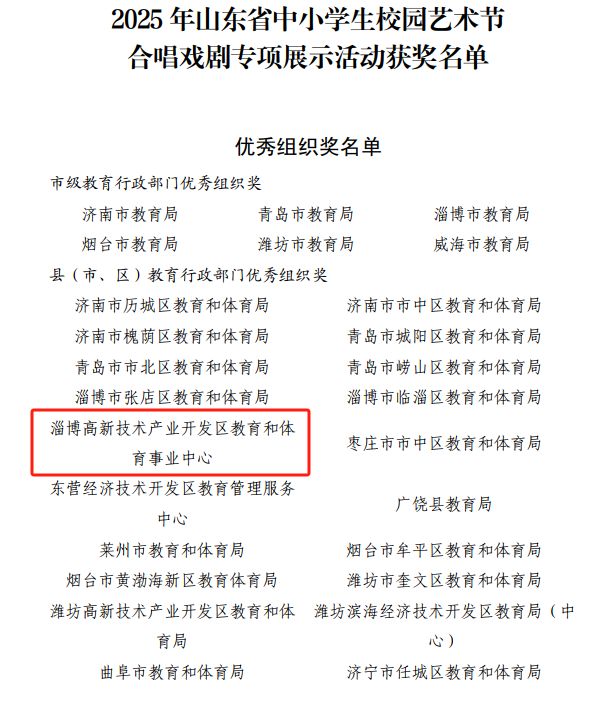 近日,山东省教育厅发布《关于公布山东省中小学生校园艺术节合唱戏剧专项展示活动获奖情况的通知》,淄博高新区喜获佳绩:推送的7个节目,荣获省级一等奖2个,二等奖4个,三等奖1个,高新区教育和体育事业中心荣获“优秀组织奖”称号。下一步,高新区将立足美育育人根本,深化美育综合改革,着力构建“全方位覆盖、全过程融入、全员参与”的美育工作体系,持续激活美育育人效能,全面赋能学校美育高质量发展,为培养德智体美劳全面发展的时代新人筑牢美育根基。